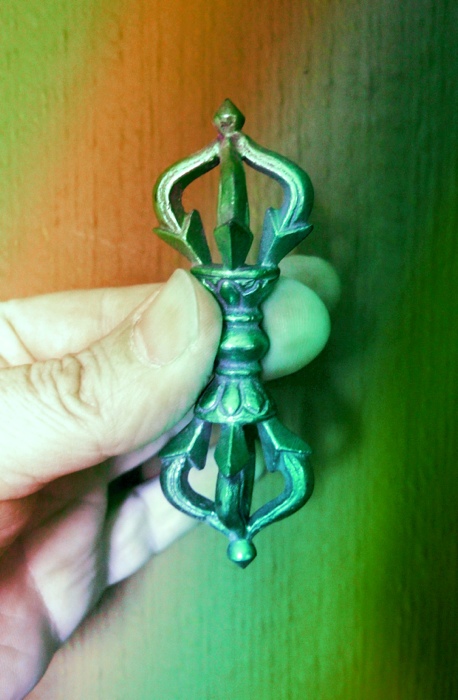 ‘Vajra’ means ‘ thunderbolt’ or ‘diamond sceptre’. ‘Vajra’ is the Indian Sanskrit name. In Tibet it is known as a ‘dorje’. Like many of the symbols of Tibetan Buddhism, it has a long lineage. It probably derives from the attribute and weapon of the early Indian sky and storm god, Indra, the primary deity of ancient Indian peoples. Like the ‘phurba’ or ‘iron nail’ it has precedents in shamanic practice for dispelling and controlling spirits.